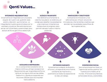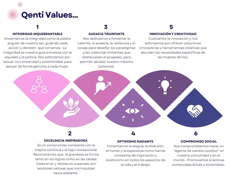 En Mujer Qenti, creemos que los valores son los principios fundamentales que guían nuestro comportamiento, las decisiones y acciones, en todos los niveles de nuestra organización. Los valores representan nuestras creencias y convicciones, es lo que define a nuestra cultura, y la forma como tratamos a nuestros colaboradores, socios, clientes, y otros stakeholders. Nuestros valores son: